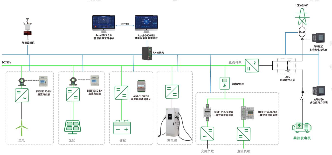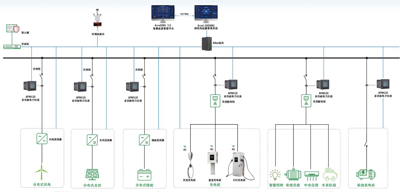 項目實施:利用Acrel-2000MG能量管理系統(tǒng)通過監(jiān)測并網(wǎng)點功率 情況結合控制策略需求實現(xiàn)目標功能。