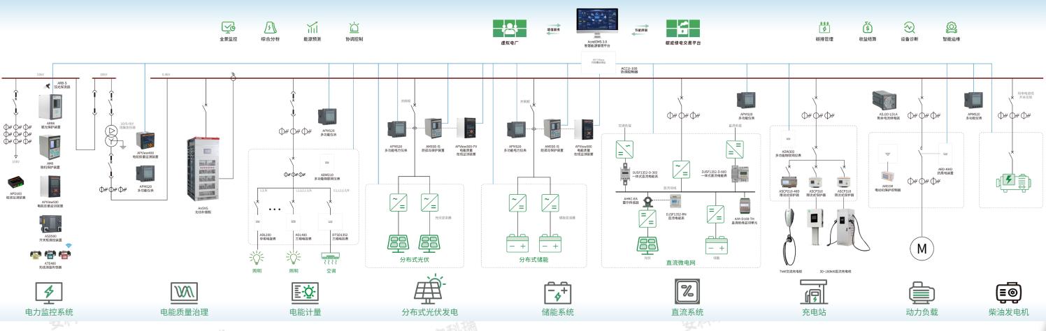 安科瑞微電網(wǎng)系統(tǒng)解決方案,通 過在企業(yè)內(nèi)部的源、網(wǎng)、荷、儲、 充的各個關鍵節(jié)點安裝安科瑞自 主研發(fā)的各類監(jiān)測、分析、保護、 治理裝置;通過優(yōu)秀的控制、計 量、通信等技術,將分布式電源、 儲能系統(tǒng)、可控負荷、電動汽車、 電能路由器聚合在一起;平臺根 據(jù)新的電網(wǎng)價格、用電負荷、 電網(wǎng)調(diào)度指令等情況,靈活調(diào)整 微電網(wǎng)控制策略并下發(fā)給儲能、 充電樁、逆變器等系統(tǒng)與設備, 保證企業(yè)微電網(wǎng)始終安全、可靠、 節(jié)約、高效、經(jīng)濟、低碳的運行。